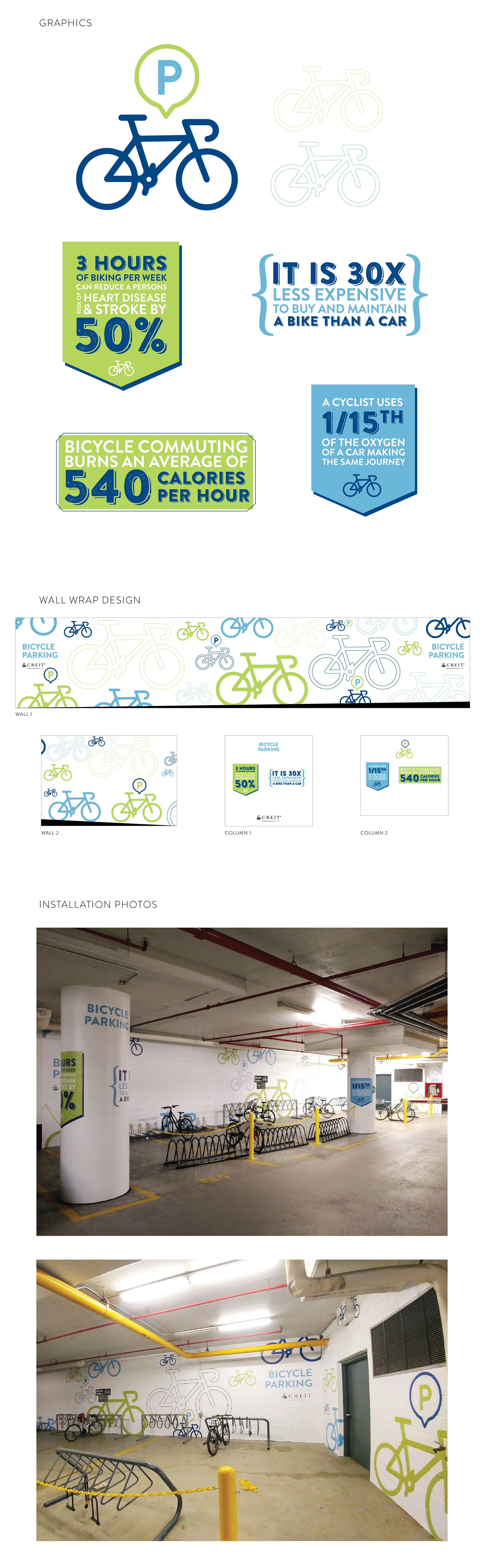 Graphics created for the bicycle storage area at 175 Bloor. I designed the graphics as well as did the research and copywriting for the facts about cycling.