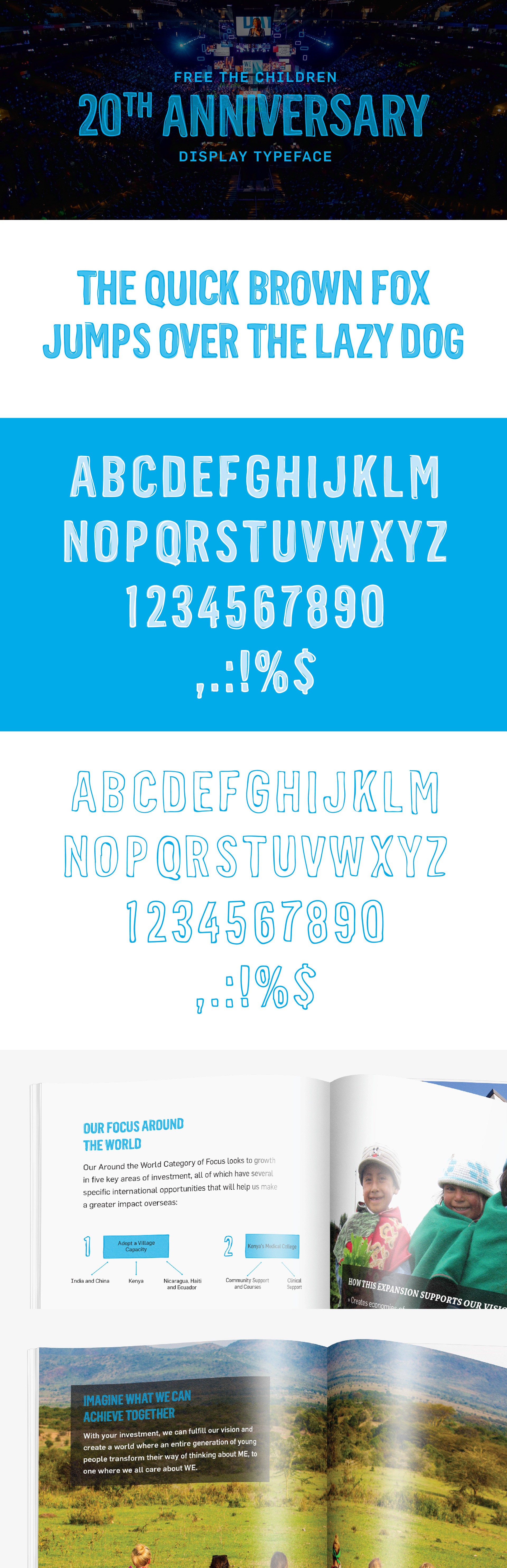 A custom, hand drawn font created for the Free The Children 20th Anniversary Brochure.