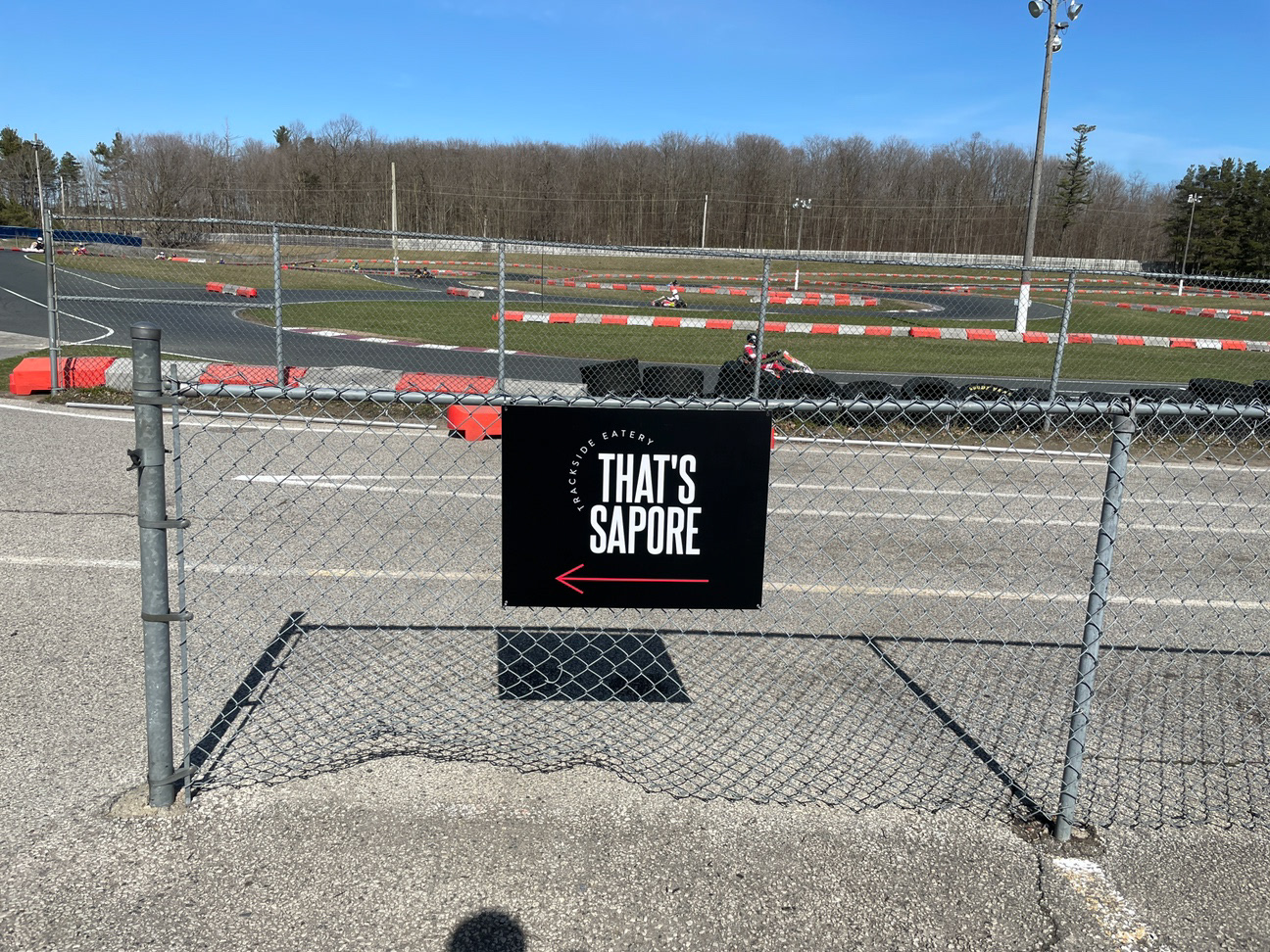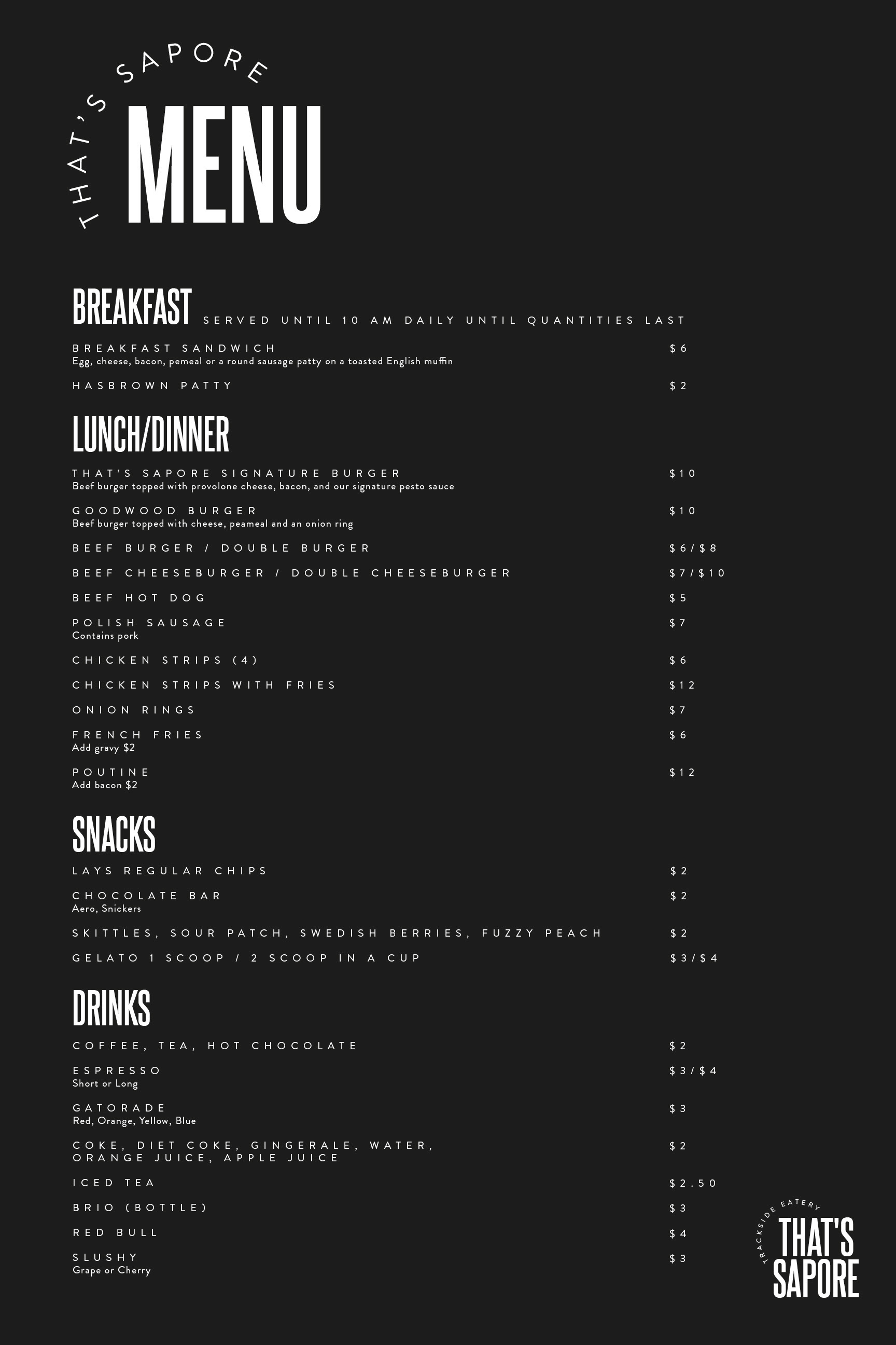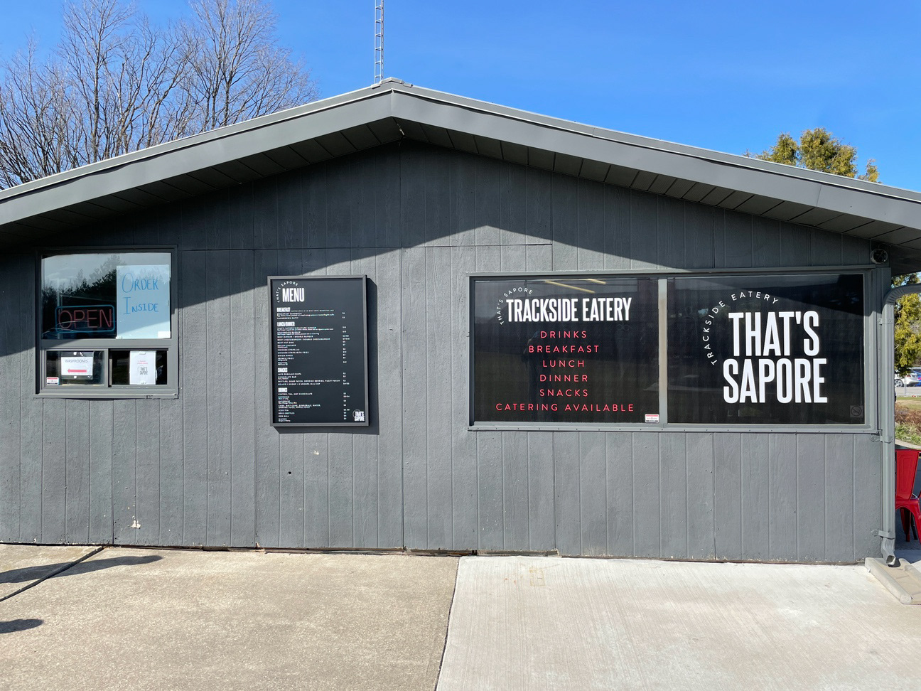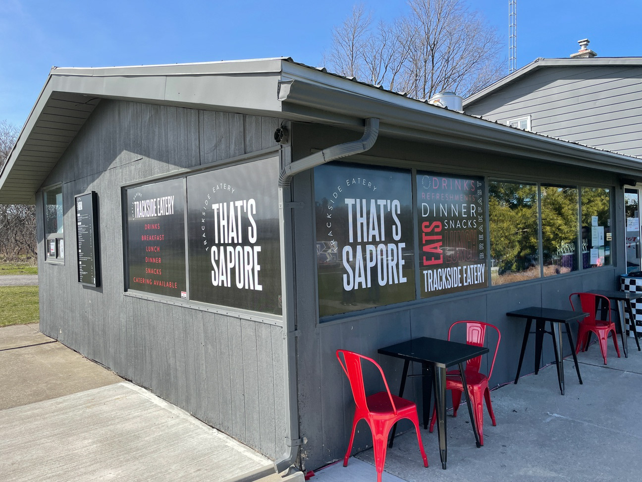 Logo, menu, and signage design for a restaurant and catering company located at a go kart track.